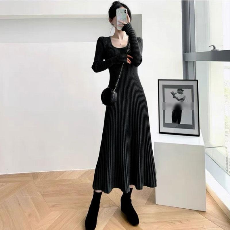 Женское платье с длинными рукавами Элегантное Винтажное Вязаное Свитер Обтягивающее Повседневное Женская Теплая Одежда Осень Зима L чёрный