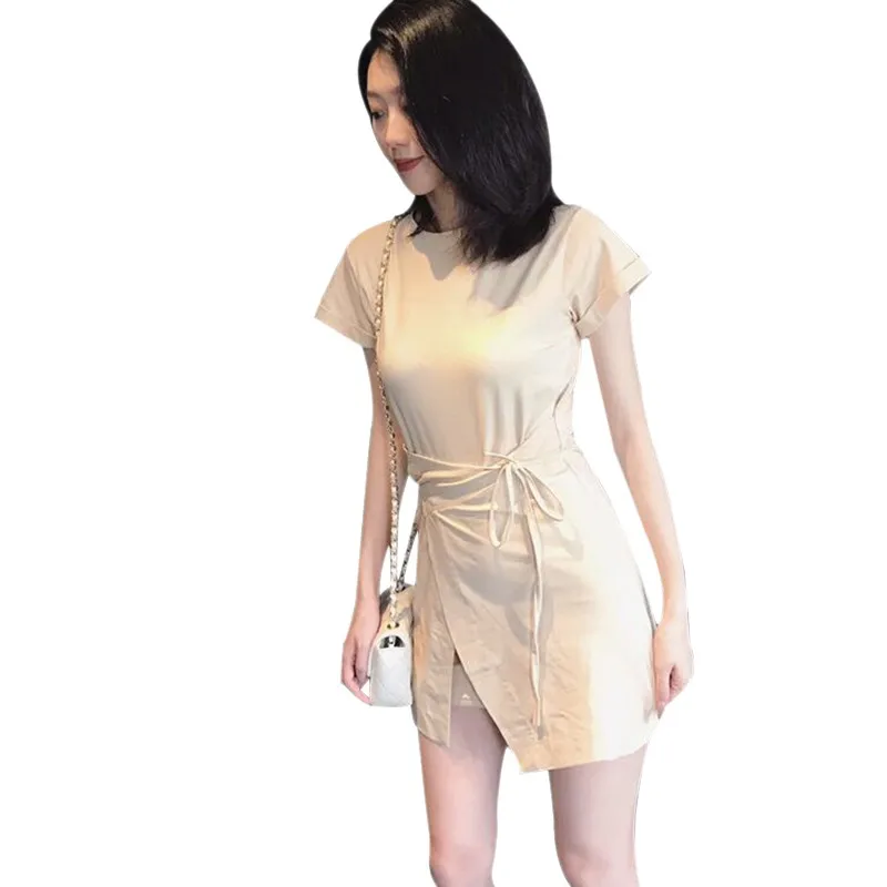 Женское платье с завязкой на талии, однотонное черное платье в Корейском стиле, модель 2020 на лето