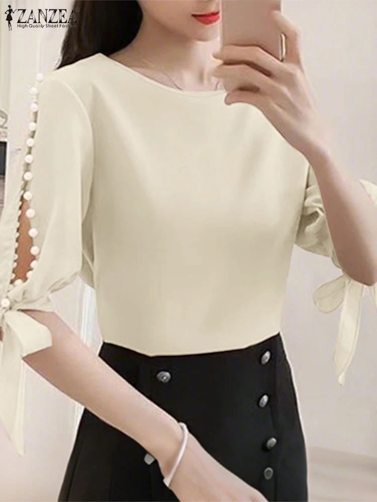 ZANZEA Casual Loose Tops Women Bow Blouse 2025 Fashion O Neck Half Lantern Sleeve Blusas Elegant Office Work Tunic Oversized