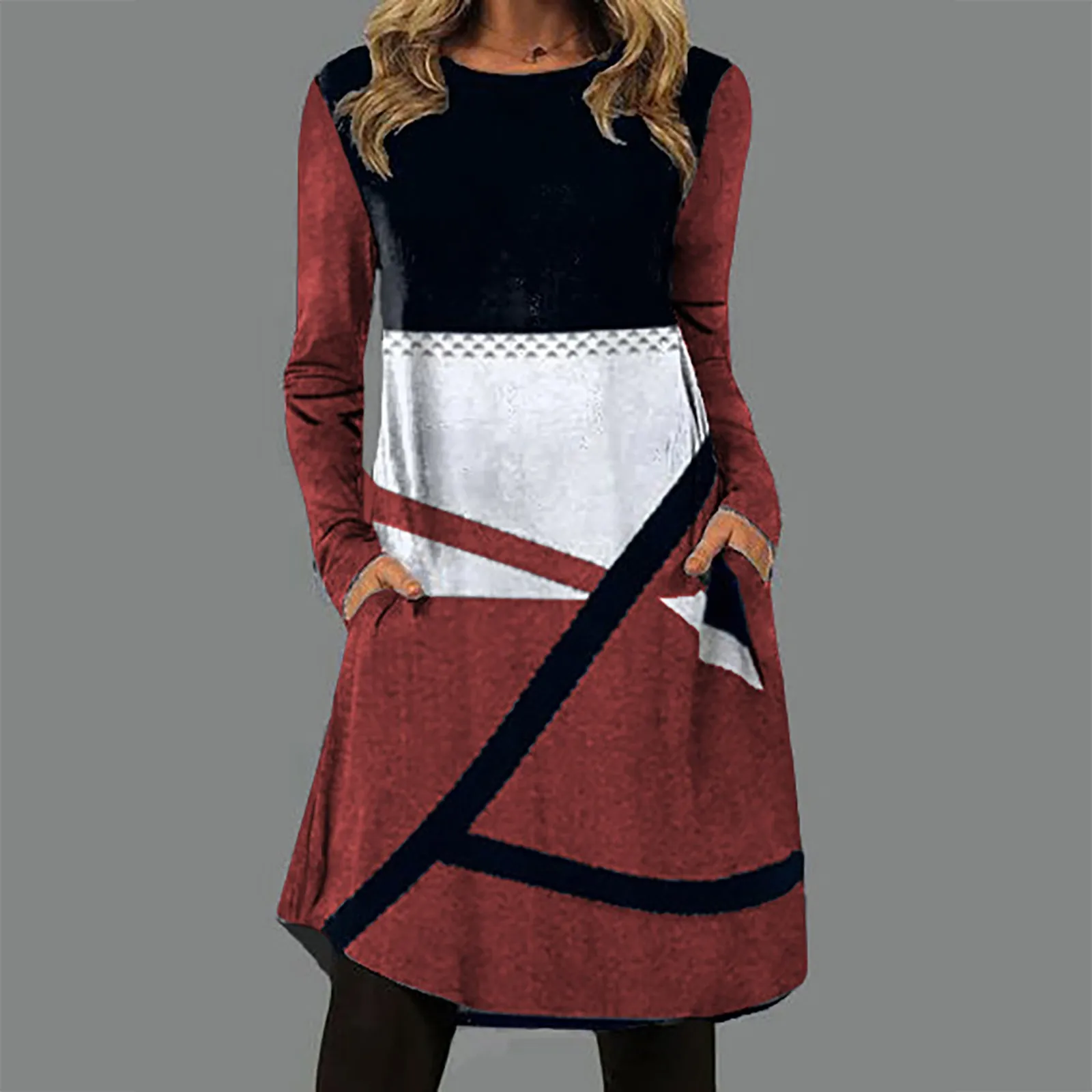 Женское платье с круглым вырезом, длинным рукавом и карманами