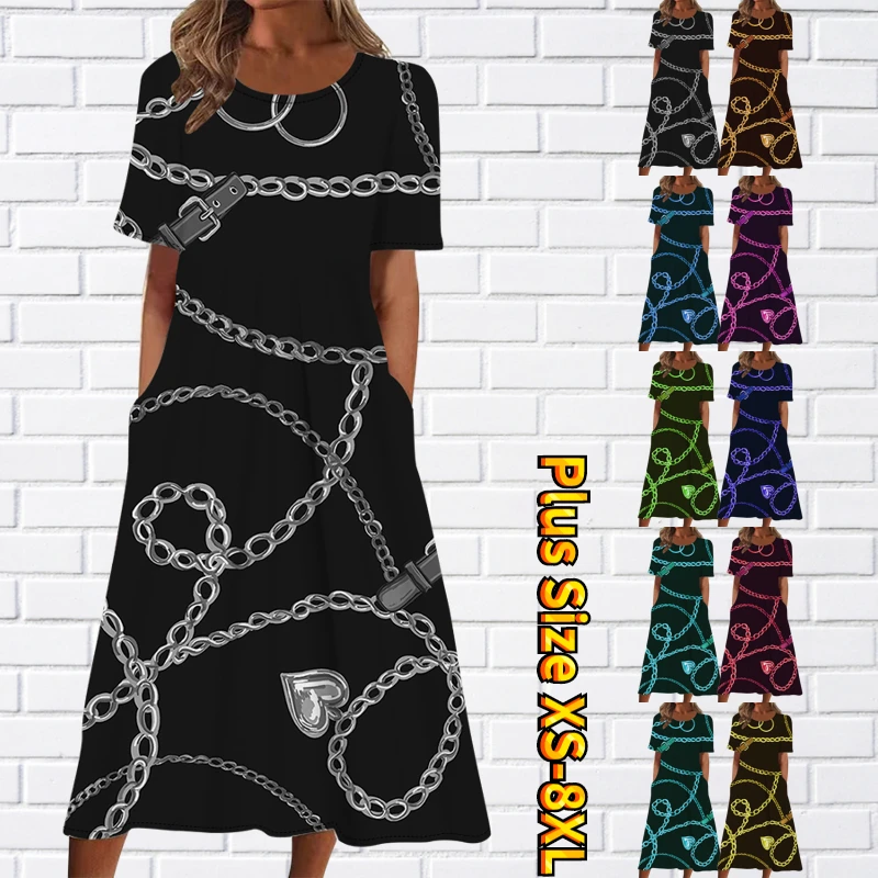 Женское платье с круглым вырезом, коротким рукавом и карманами
