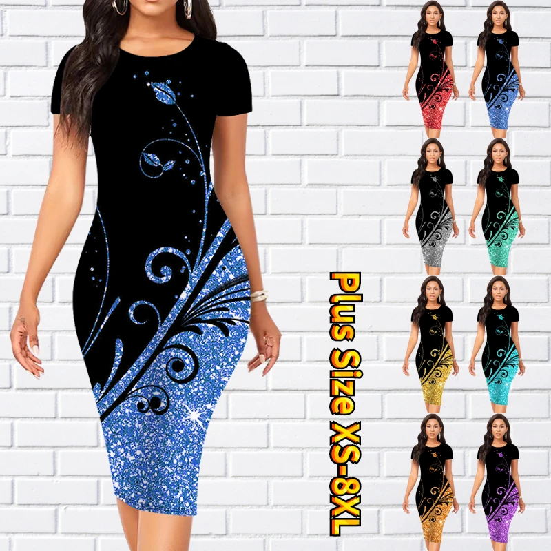 Женское платье с круглым вырезом, коротким рукавом и принтом, до колена