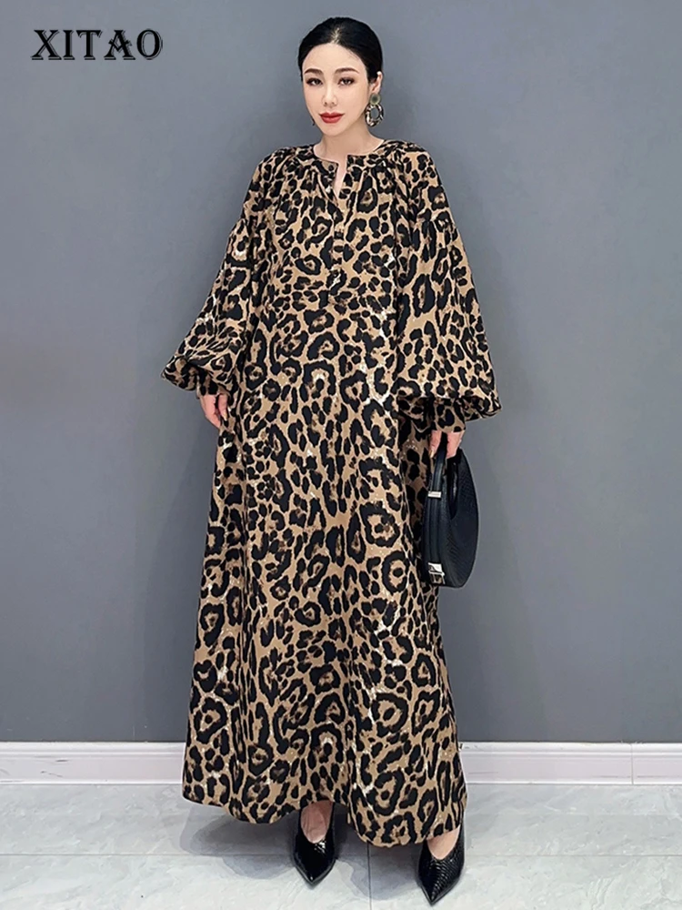 Женское платье с леопардовым принтом XITAO, осеннее платье с v-образным вырезом, тонкое свободное платье HQQ1475