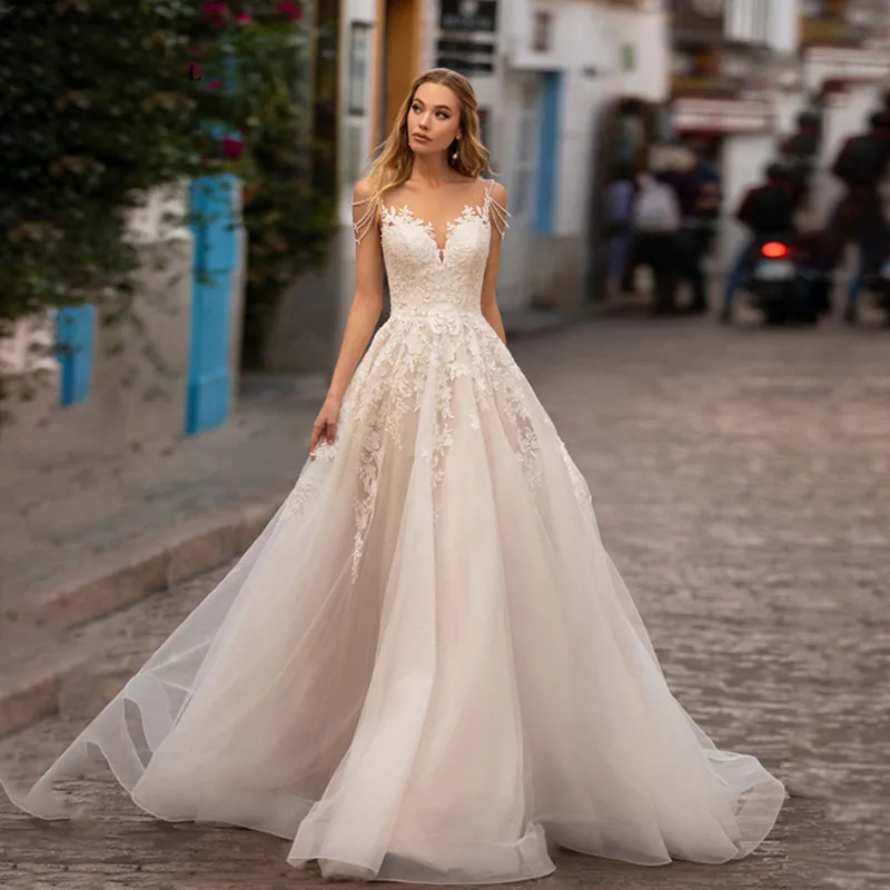 Женское платье с открытой спиной, фатиновое платье с глубоким V-образным вырезом и аппликацией на бретелях-спагетти со шлейфом, лето 2023