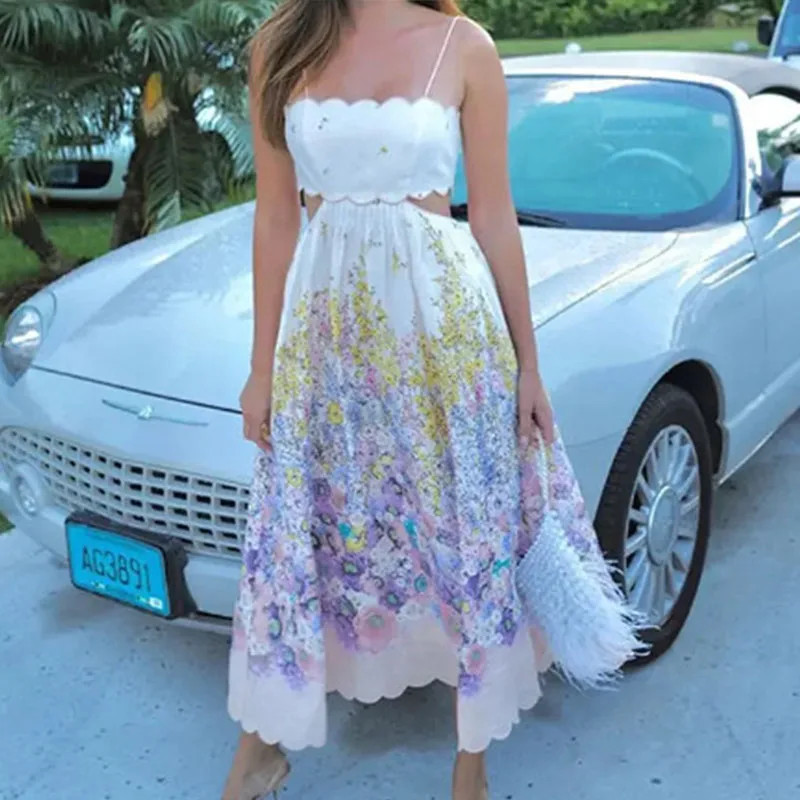 Женское платье с открытыми плечами, повседневное Длинное свободное платье трапециевидной формы с цветочным принтом, без рукавов, на бретельках, элегантный наряд для отдыха