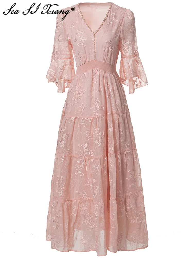 Женское платье с поясом на резинке, V-образным вырезом и Расклешенным рукавом