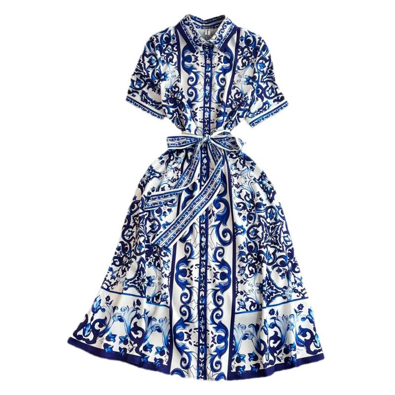 Женское платье с принтом в китайском стиле, с лацканами, короткими рукавами, поясом, однобортное, контрастного цвета, платья, лето 2024, новинка 27C216 XXL синий