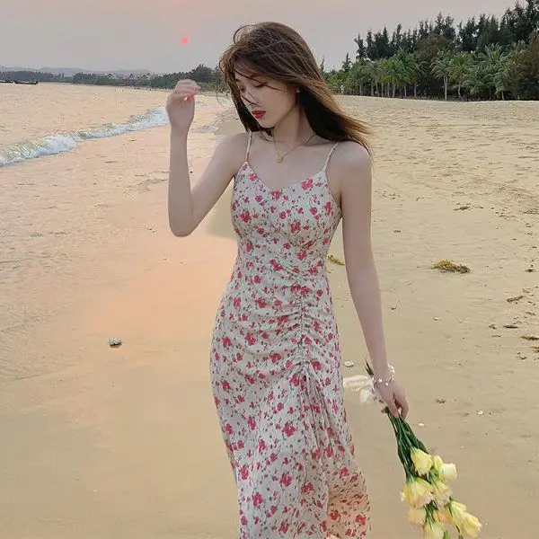 Женское платье с разрезом и цветочным принтом, приталенное шифоновое платье на бретелях во французском стиле, лето 2021