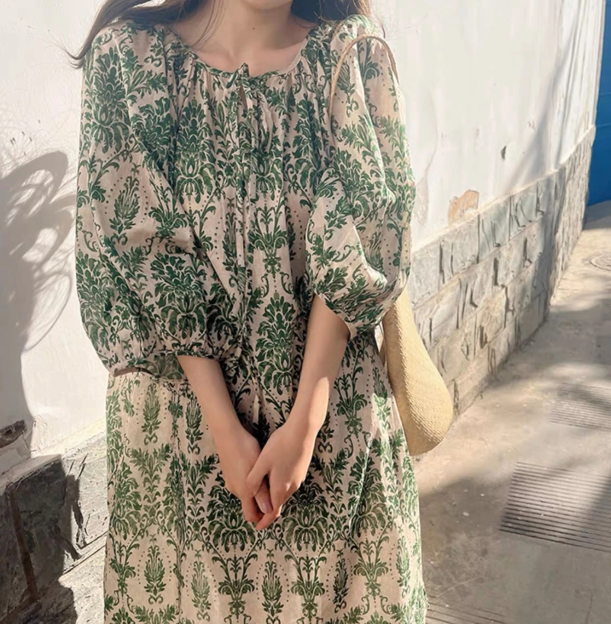 Женское платье с рукавами-фонариками, Элегантное Длинное Платье в стиле ретро с круглым вырезом и цветочным принтом на весь экран, лето