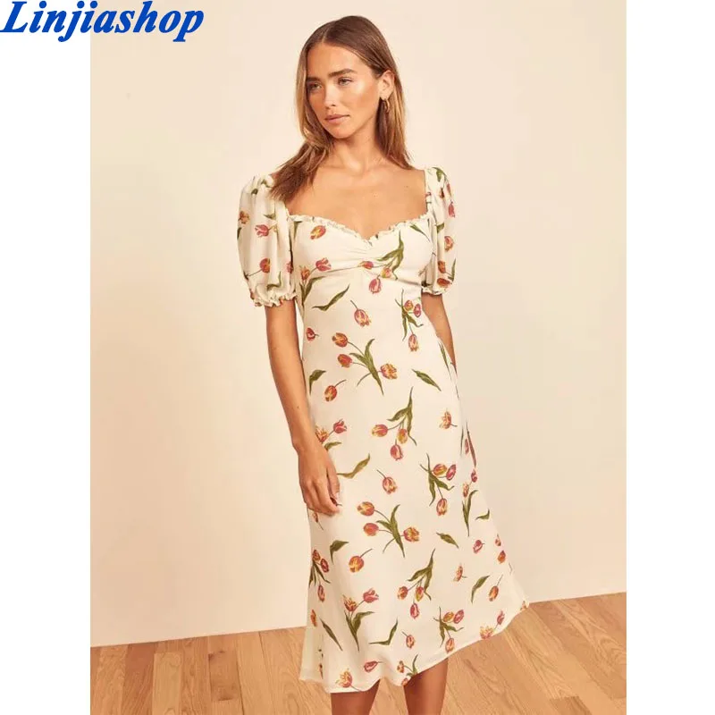 Женское платье с французским тюльпаном и цветочным принтом, с подкладкой, на молнии сзади, с коротким рукавом и рюшами, осеннее платье