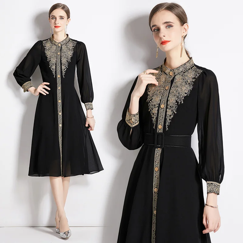 Женское платье с цветочной вышивкой, платье с длинным рукавом-фонариком и воротником-стойкой