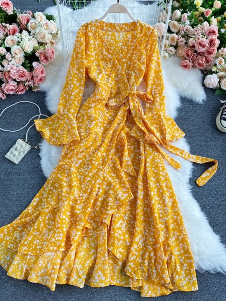 Женское платье с цветочным принтом, элегантное платье с длинным рукавом и V-образным вырезом, женское платье 2023, модная шифоновая облегающая женская одежда с воланами