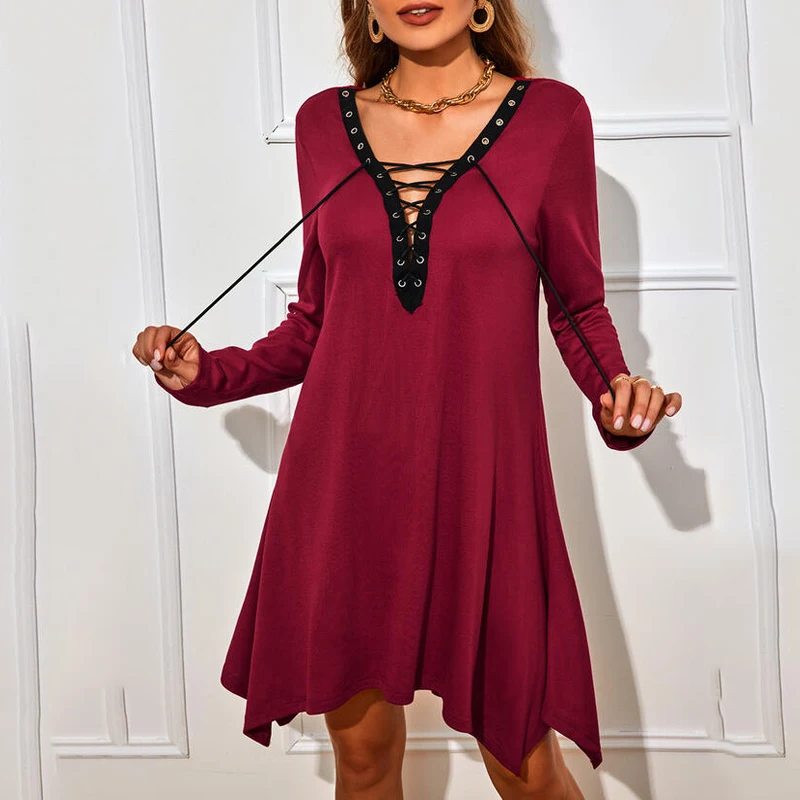 Женское платье с V-образным вырезом и длинным рукавом, свободного покроя