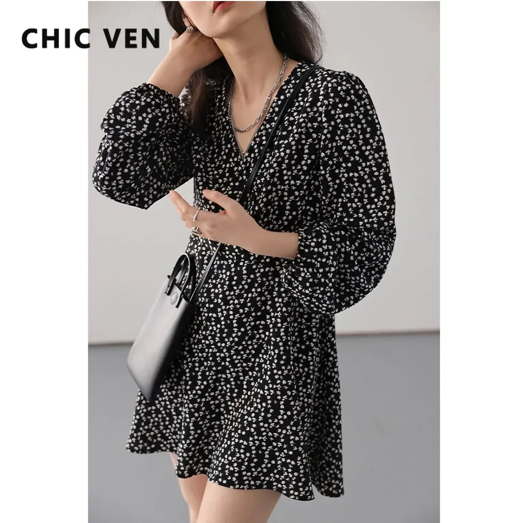 Женское платье с V-образным вырезом, длинным рукавом и цветочным принтом
