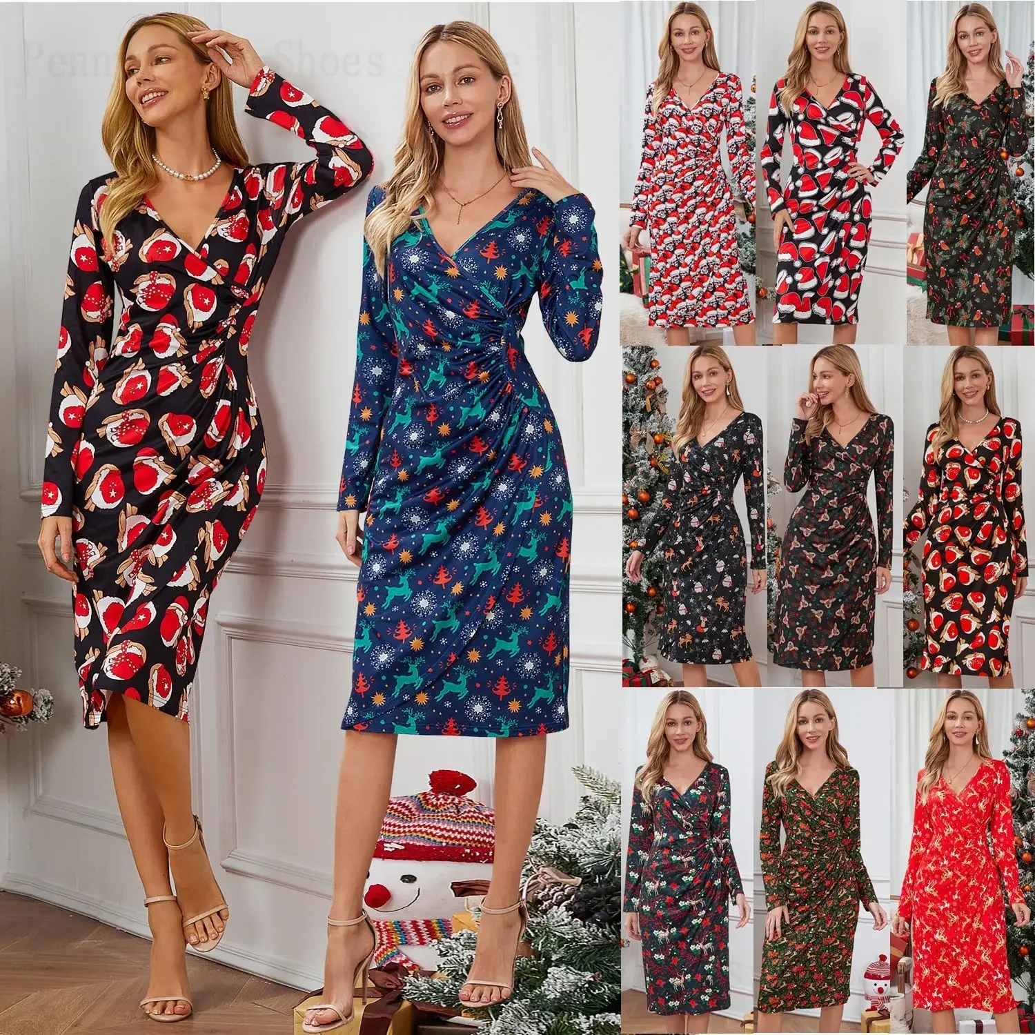 Женское платье с V-образным вырезом, облегающая юбка большого размера с рождественским принтом, Осень-зима 2023