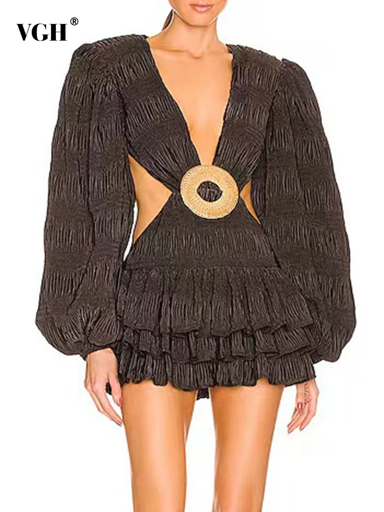 Женское платье с V-образным вырезом VGH, однотонное мини-платье с длинными рукавами-фонариками и высокой талией, стильная одежда для лета, 2022