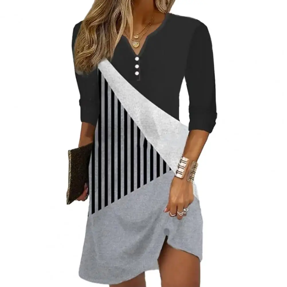 Женское платье-трапеция с принтом, длинным рукавом и V-образным вырезом