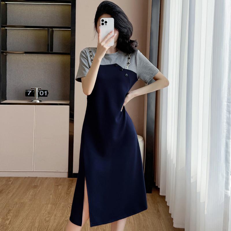 Summer Autumn Loose Casual Short Sleeve T-shirt Vintage Lace Up Slip Dress Two Pieces Set Ladies Letter Printing Tee Slit Robe