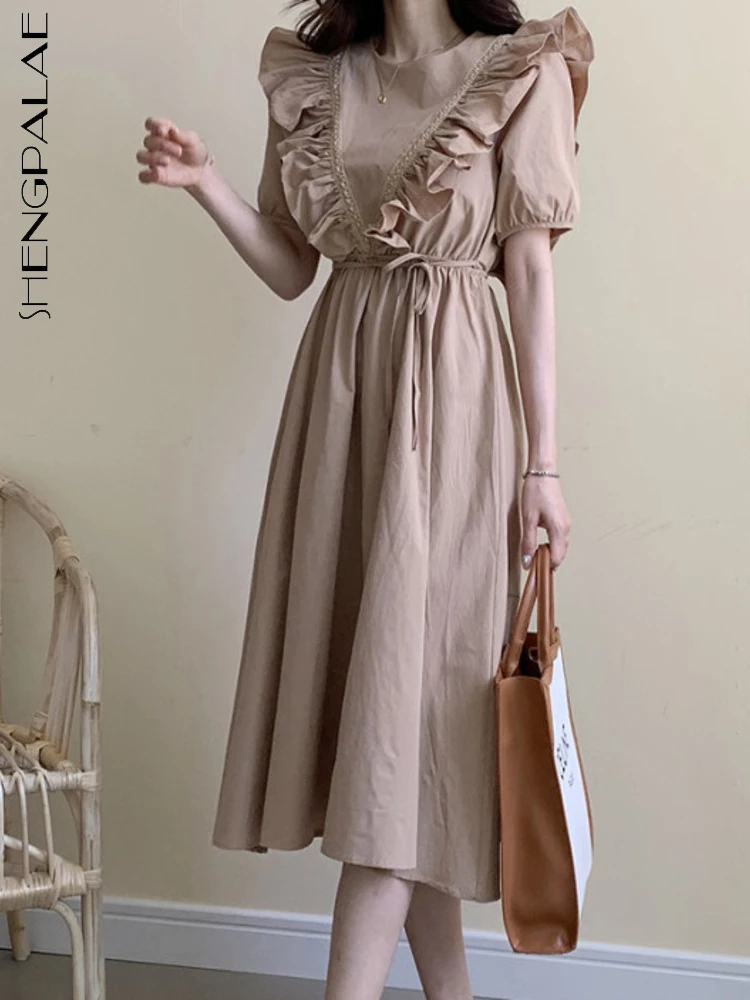 Женское платье SHENGPALAE, свободное однотонное платье с оборками, Повседневное платье с круглым вырезом и коротким рукавом, высокая талия, длин...