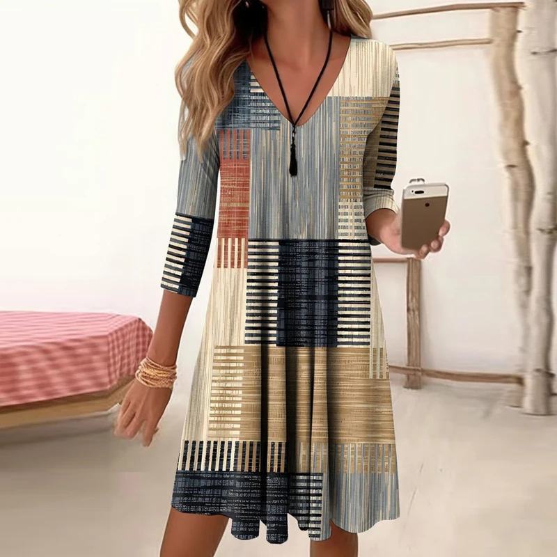 Женское плиссированное платье в полоску, с V-образным вырезом и длинным рукавом