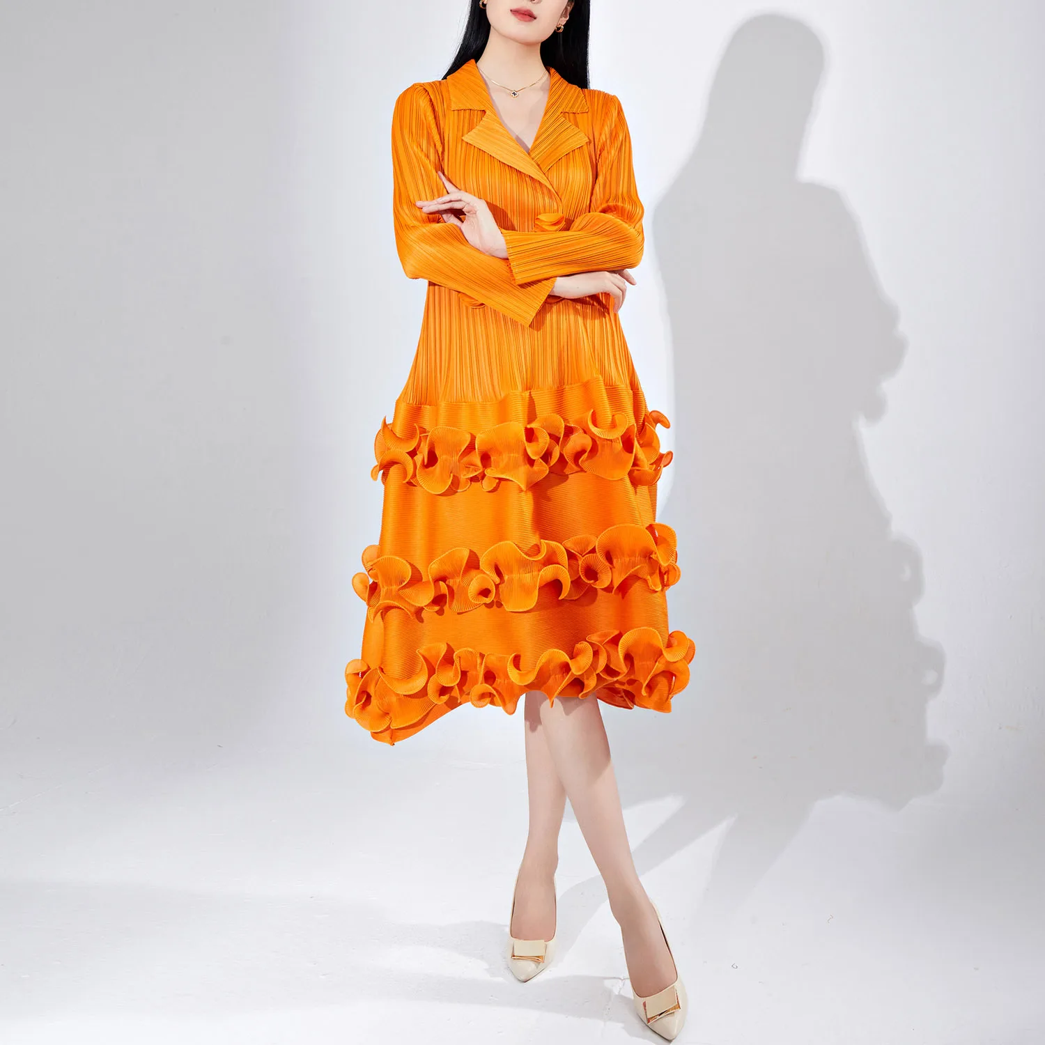 Женское плиссированное платье миди с длинным рукавом, с деревянным ушком
