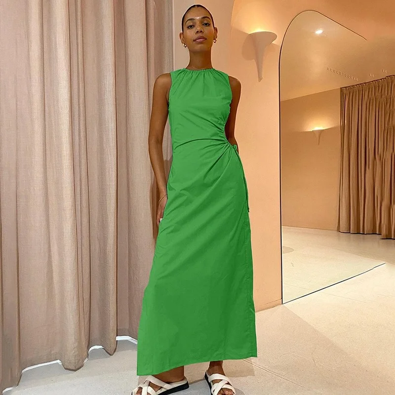 Женское плиссированное платье, однотонное Плиссированное облегающее платье из хлопка и льна с круглым вырезом, лето 2023