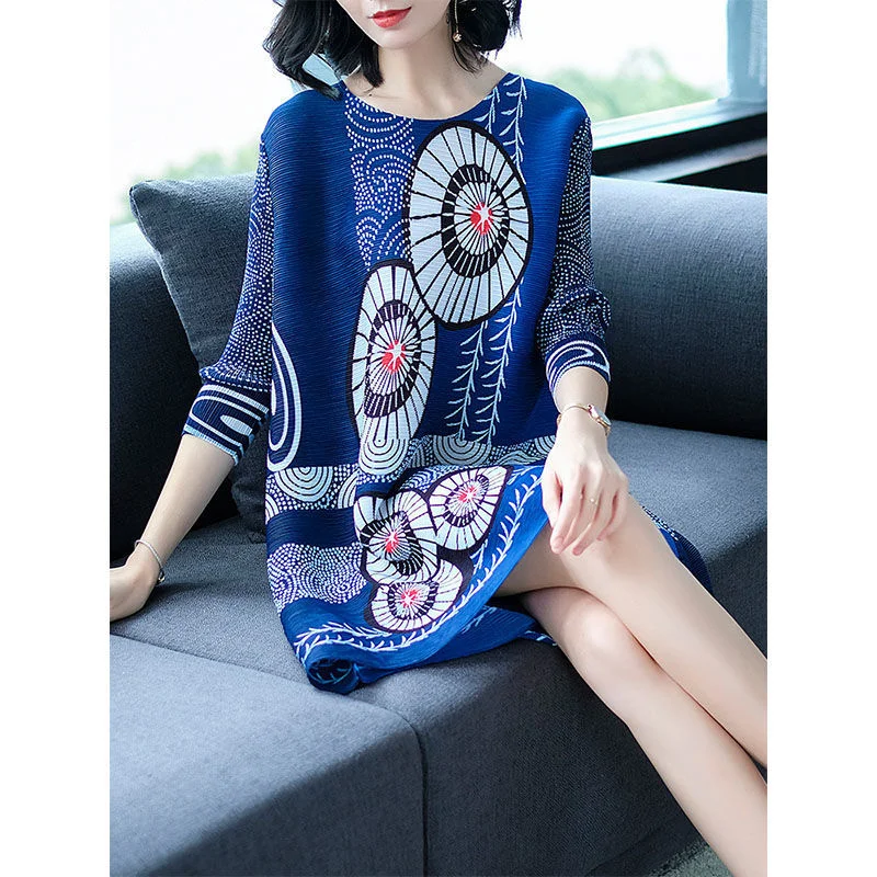 Женское плиссированное платье с круглым вырезом, рукавом 2023 и принтом