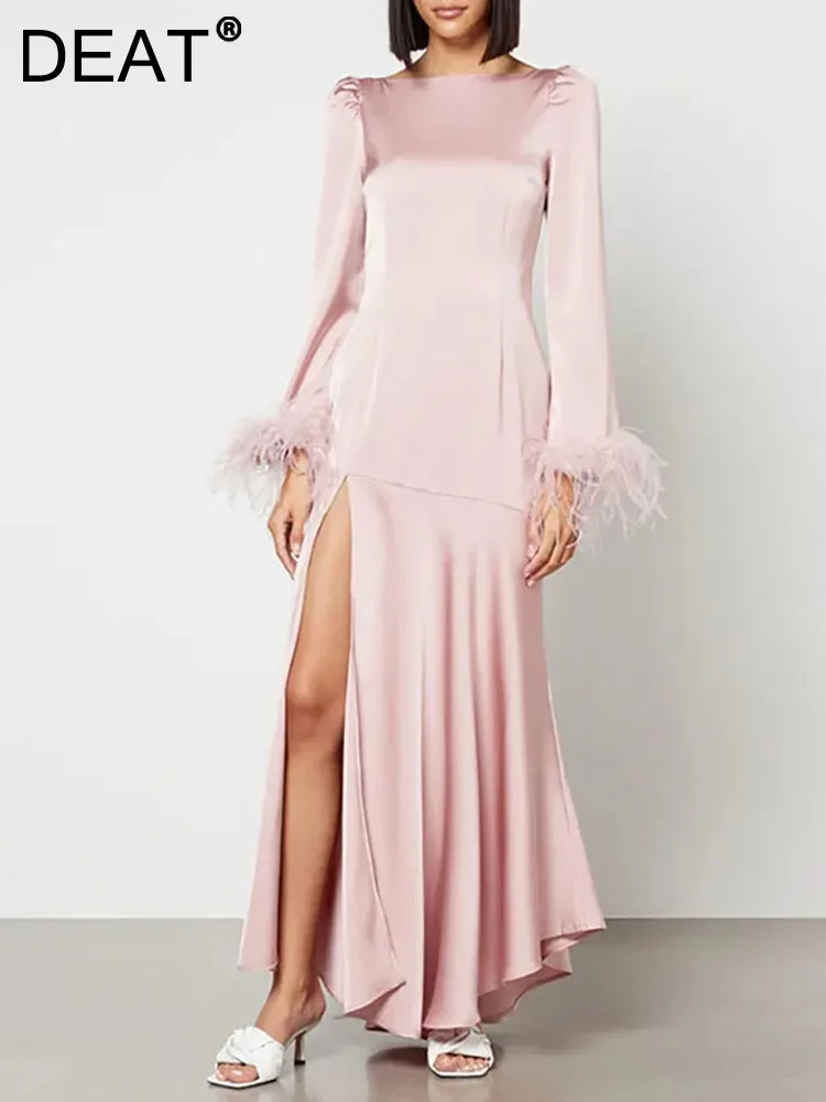 Женское плиссированное платье с перьями DEAT, элегантное весеннее платье с длинным рукавом, с асимметричным подолом, модель 13DB4653, 2024