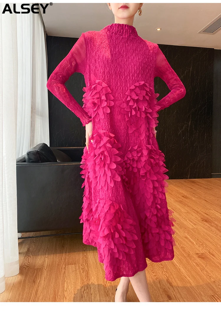 Женское плиссированное платье ALSEY Miyake, элегантное офисное платье с круглым вырезом, длинным рукавом и цветочной вышивкой, одежда на лето 2023