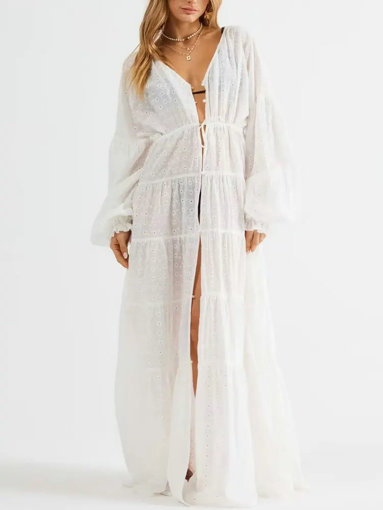Женское пляжное платье с вышивкой, белое хлопковое кружевное платье-макси с длинным рукавом и V-образным вырезом, лето 2023