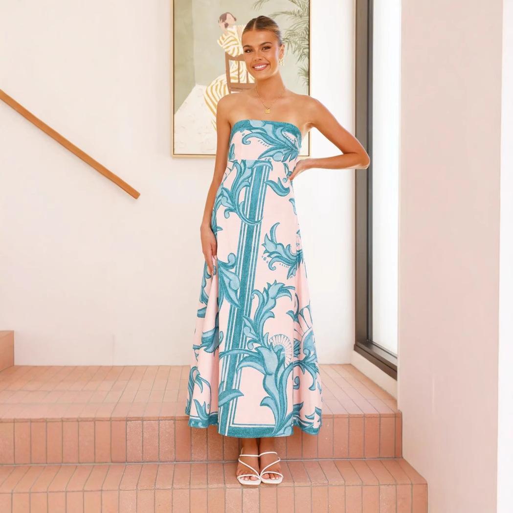 Женское пляжное платье-труба с цветочным принтом в стиле бохо без бретелек летние платья макси повседневные платья с открытыми плечами без рукавов с высокой талией длинные платья для женщин XL светло-синий