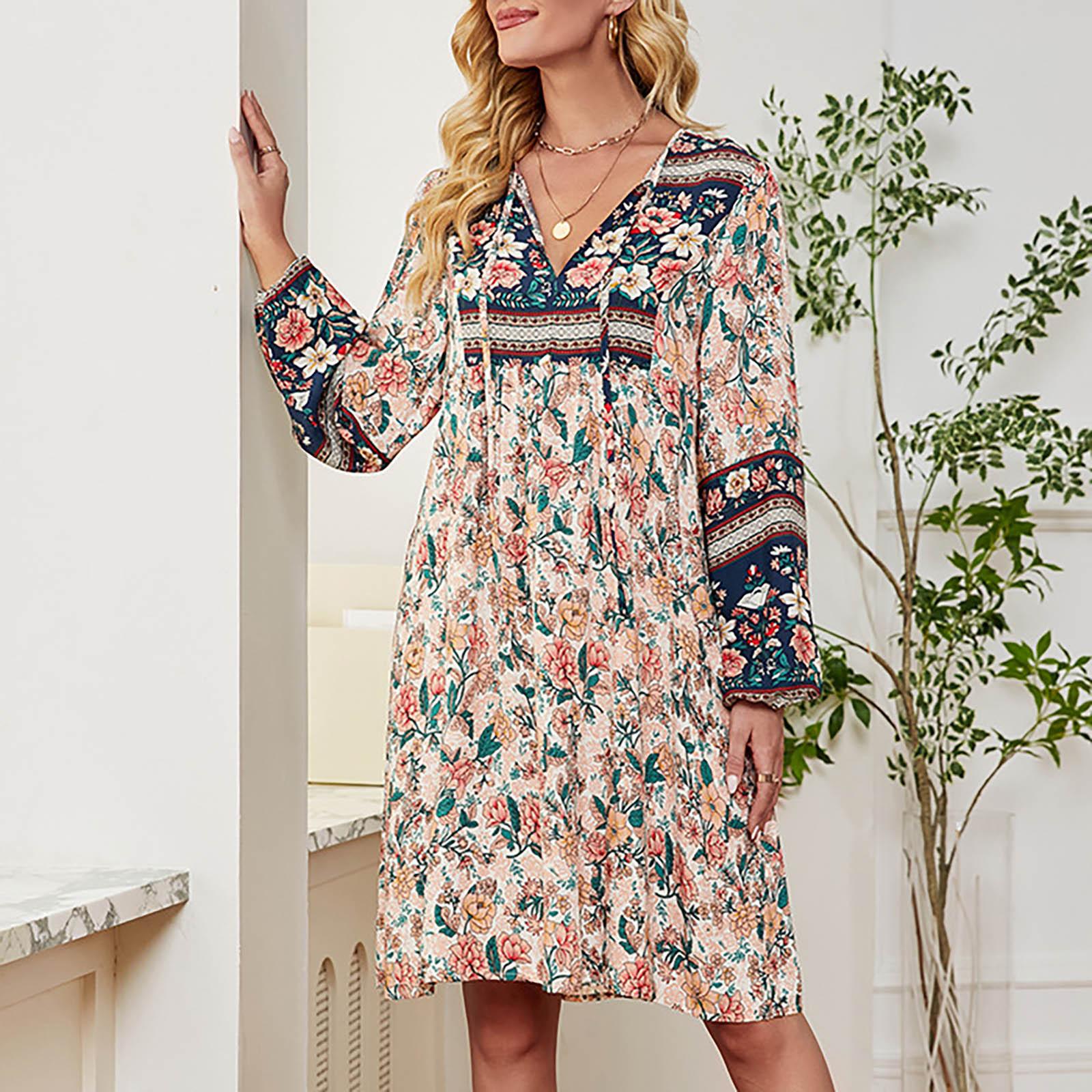 2021 Women’s Casual Long Sleeve Skinny Dress Lady Fashion Printing Round Neck Irregular Mid-length Dress S/M/L Color S/M/L