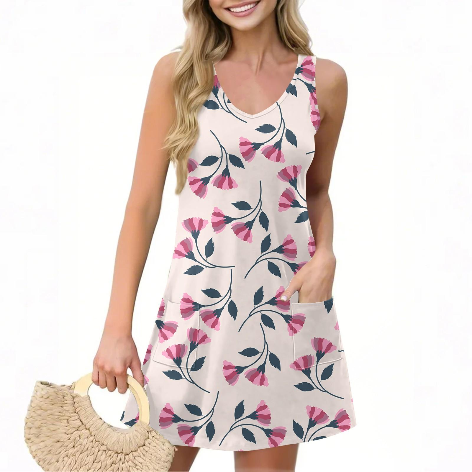 Женское повседневное летнее платье-жилет с карманами, цветочным принтом, V-образным вырезом, без рукавов L армия зеленый