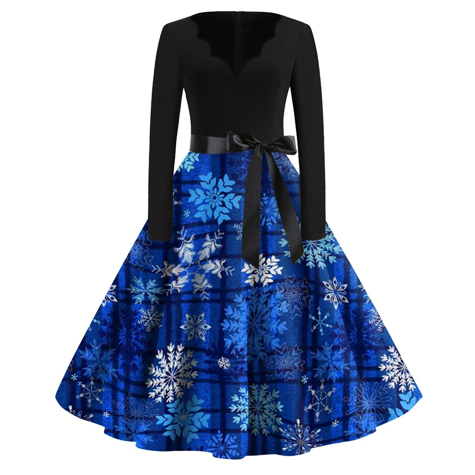Женское повседневное модное длинное платье с V-образным вырезом и длинным рукавом с рождественским принтом в винтажном стиле XL синий
