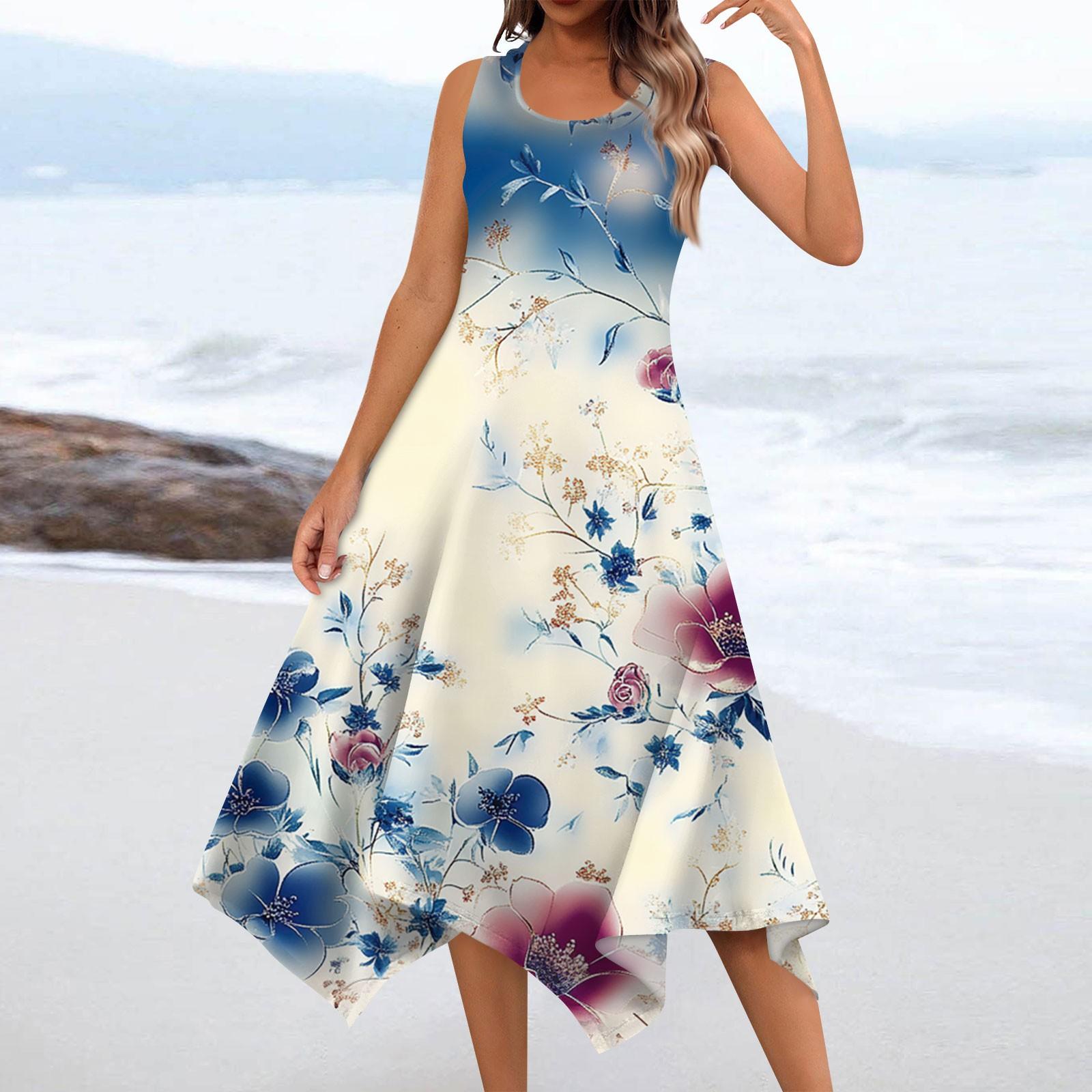 Женское повседневное модное платье миди без рукавов с круглым вырезом и цветочным принтом, нерегулярный подол XL небесно-голубой