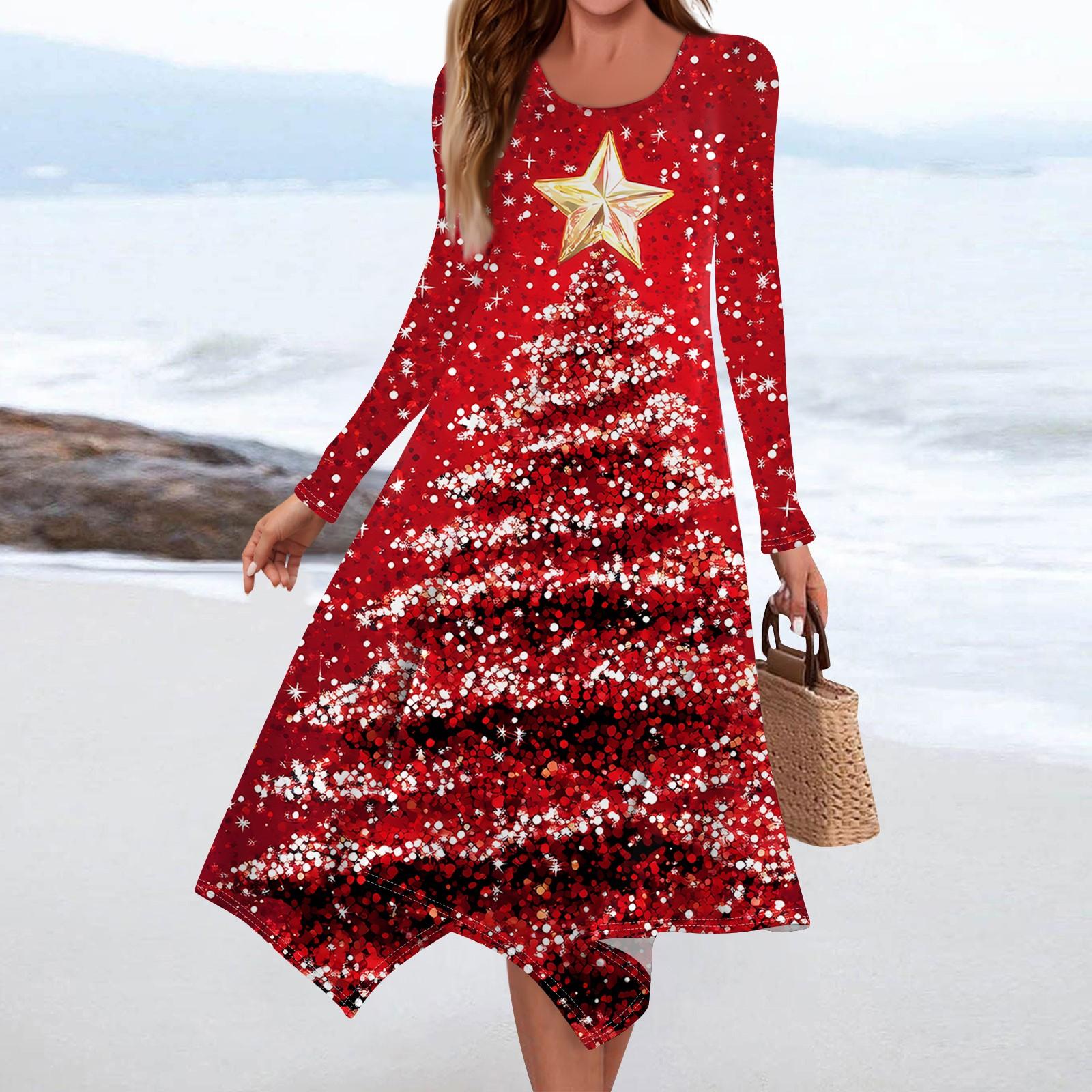 Женское повседневное модное платье миди с круглым вырезом и длинным рукавом с принтом и неровным подолом XL