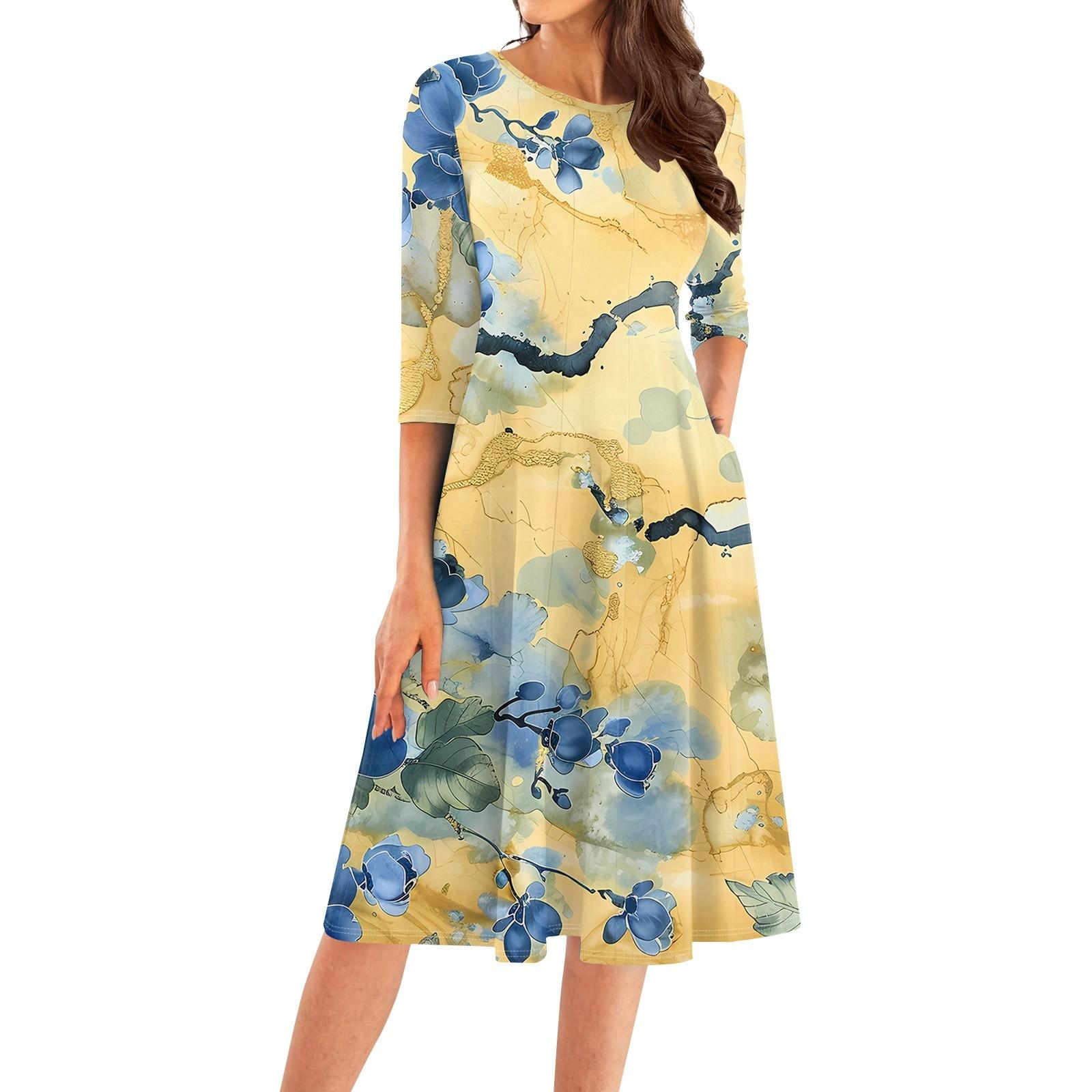 Женское повседневное модное платье миди с круглым вырезом и рукавом три четверти XL жёлтый