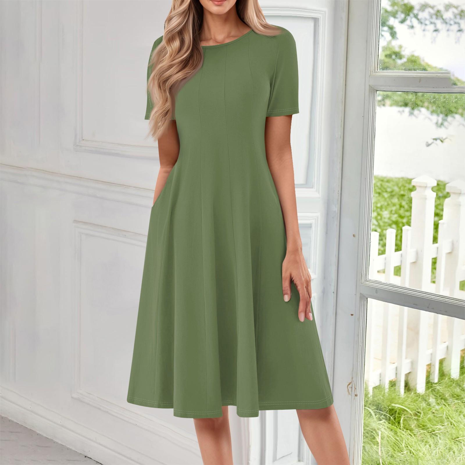 Женское повседневное и модное платье с круглым вырезом и коротким рукавом, однотонное, средней длины L армия зеленый