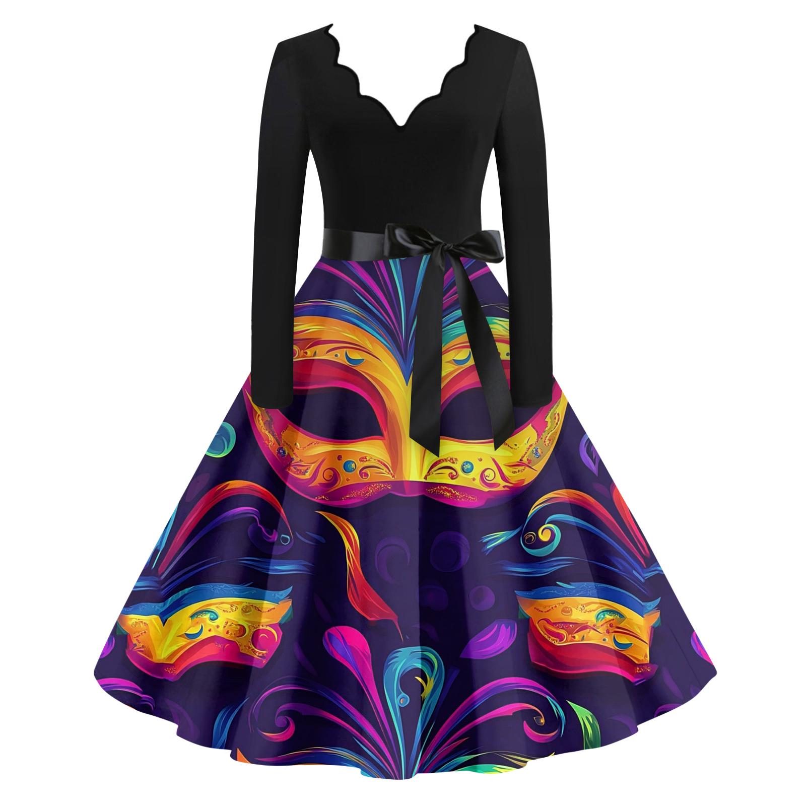 Женское повседневное модное платье с V-образным вырезом и длинным рукавом с принтом в винтажном стиле XL