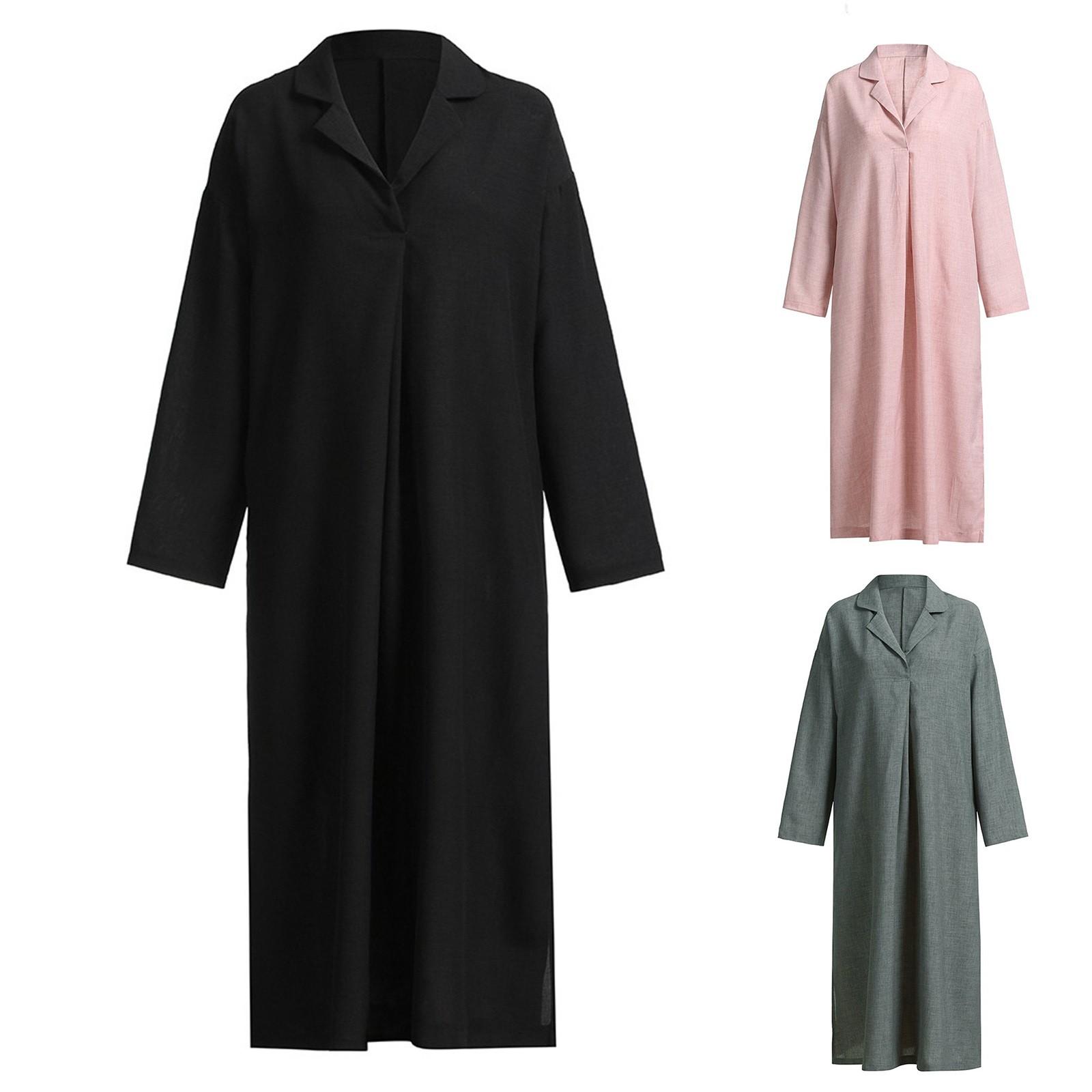 Женское повседневное однотонное свободное платье большого размера из хлопка и льна с длинными рукавами в стиле ретро