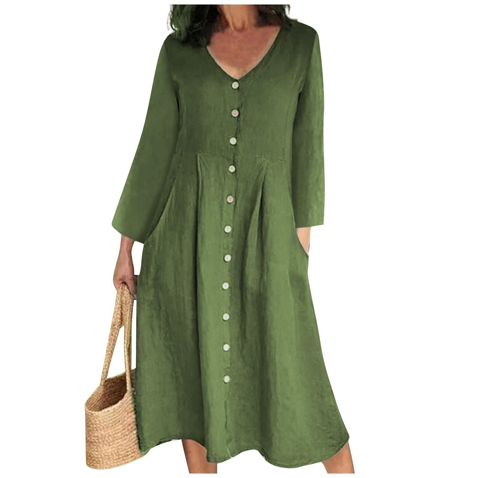 Женское повседневное однотонное свободное хлопковое льняное платье с длинными рукавами и высокой талией L армия зеленый