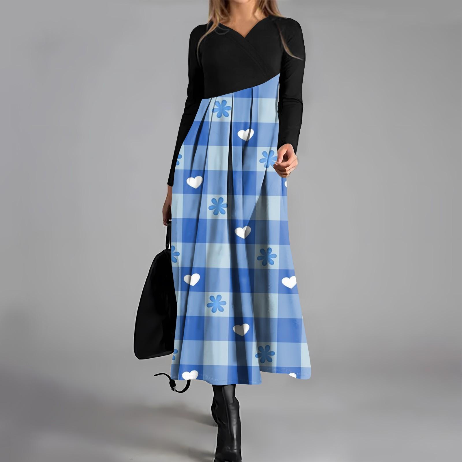 Женское повседневное платье с V-образным вырезом, длинными рукавами, клетчатым принтом, карманом на талии и свободным кроем XL небесно-голубой