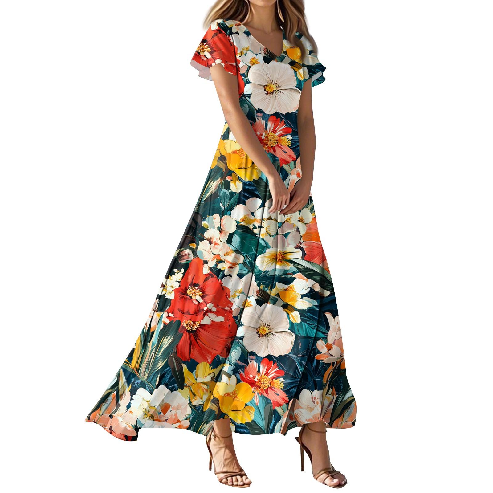 Женское повседневное платье с V-образным вырезом, коротким рукавом, высокой талией и принтом в виде цветов и листьев в стиле ретро S зелёный