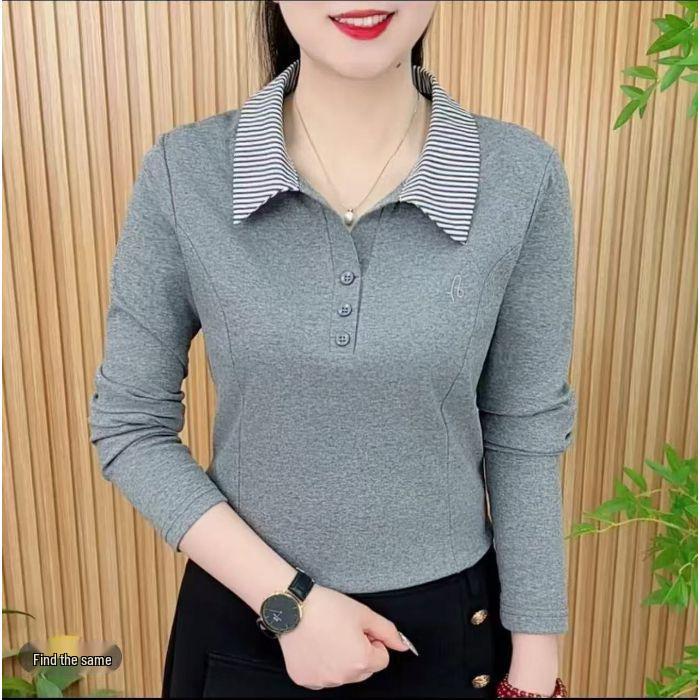 Женское поло премиум-класса с длинным рукавом: Весна/Осень 2025, Отложной воротник, Однотонный, Универсальный топ для ношения мамой 5XL серый