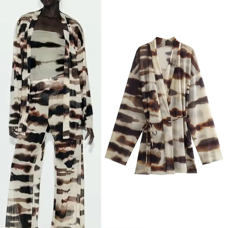 Женское полупрозрачное кимоно с принтом, V-образным вырезом и длинным рукавом