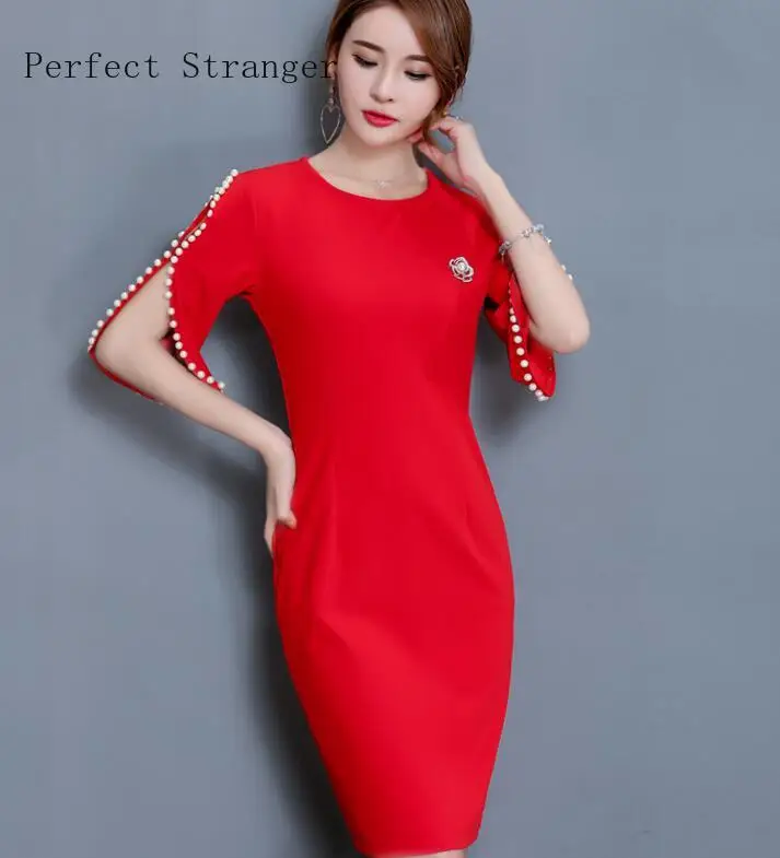 Женское приталенное платье с круглым вырезом, полурукавом и жемчужинами