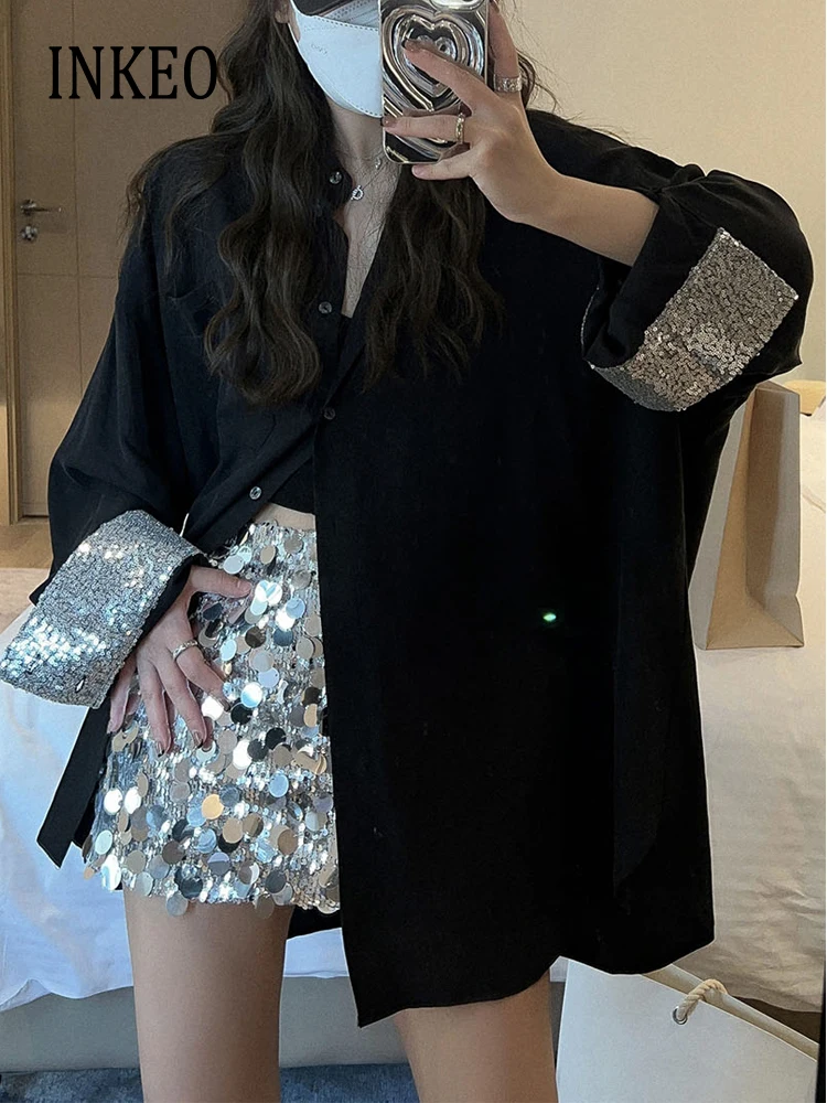 Club fashion women sequined long sleeve blouse Black Spring Autumn Oversized shirt Turn down collar top Korean Style INKEO 3T131