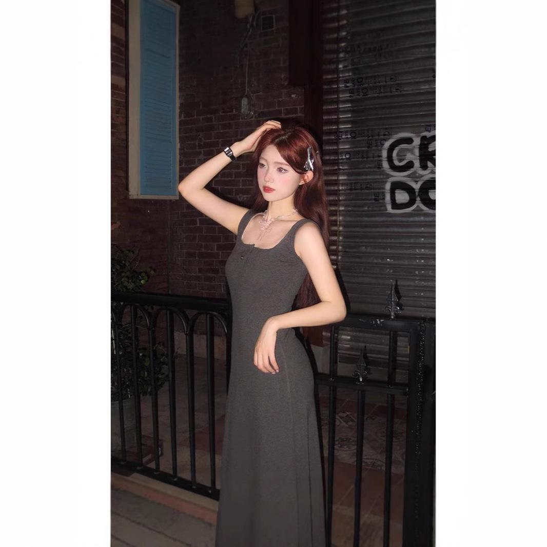 Женское приталенное черное платье-миди на тонких бретельках S серый