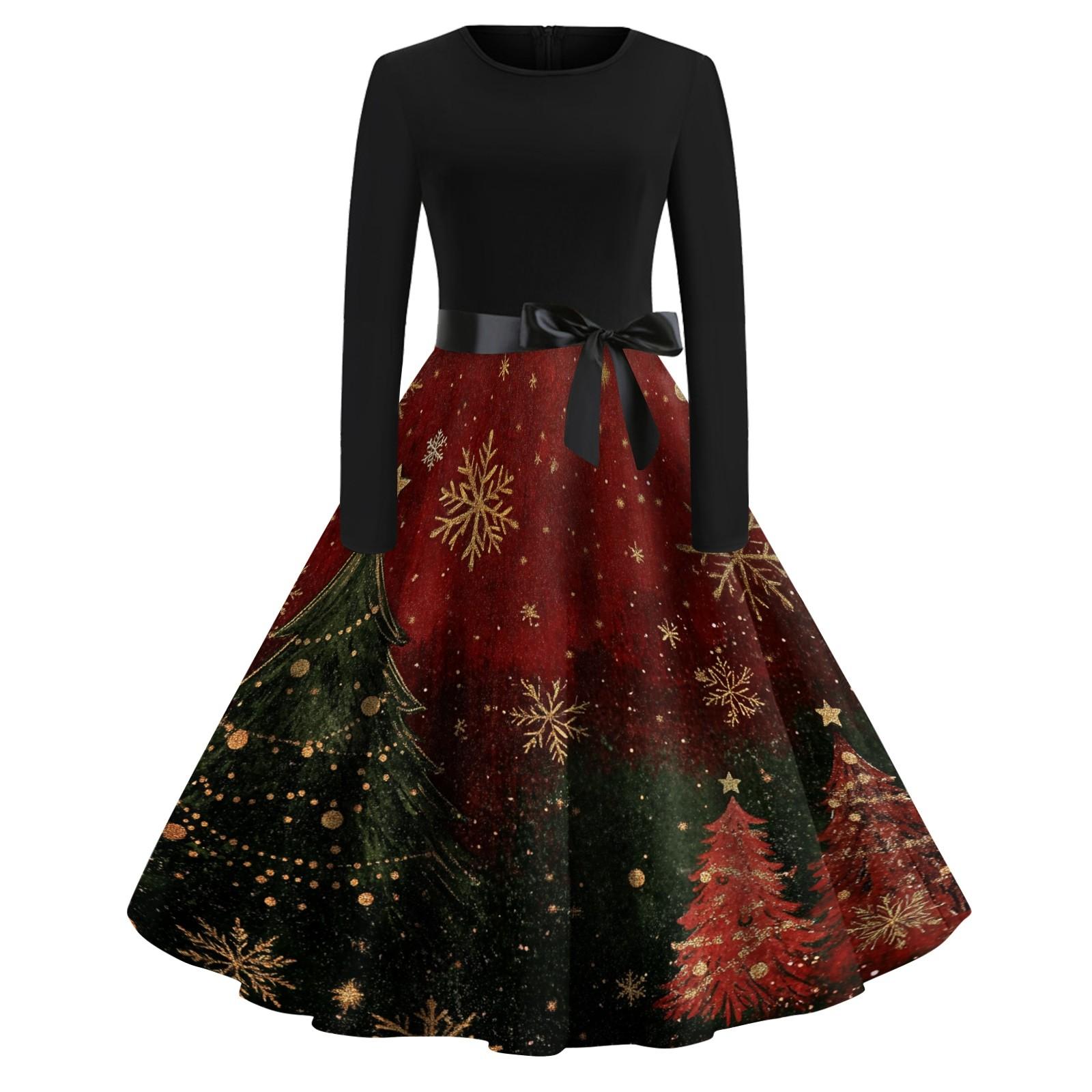 Женское рождественское платье с круглым вырезом и большим подолом, плиссированная юбка с длинными рукавами XXXL