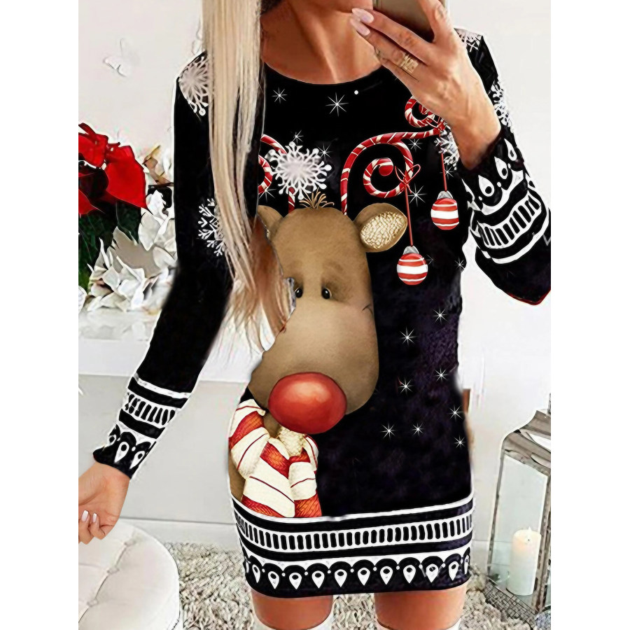 women dresses,женское рождественское платье с круглым вырезом и длинными рукавами с принтом лося